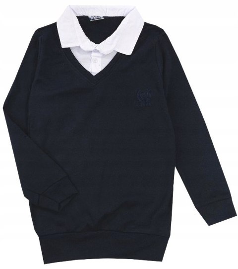 Koszula, a właściwie sam kołnierzyk w kolorze białym, sweter "w serek" granatowy, doszyty do koszuli, wykończony ściągaczami, na łokciach ozdobne łaty, a na piersi haft.